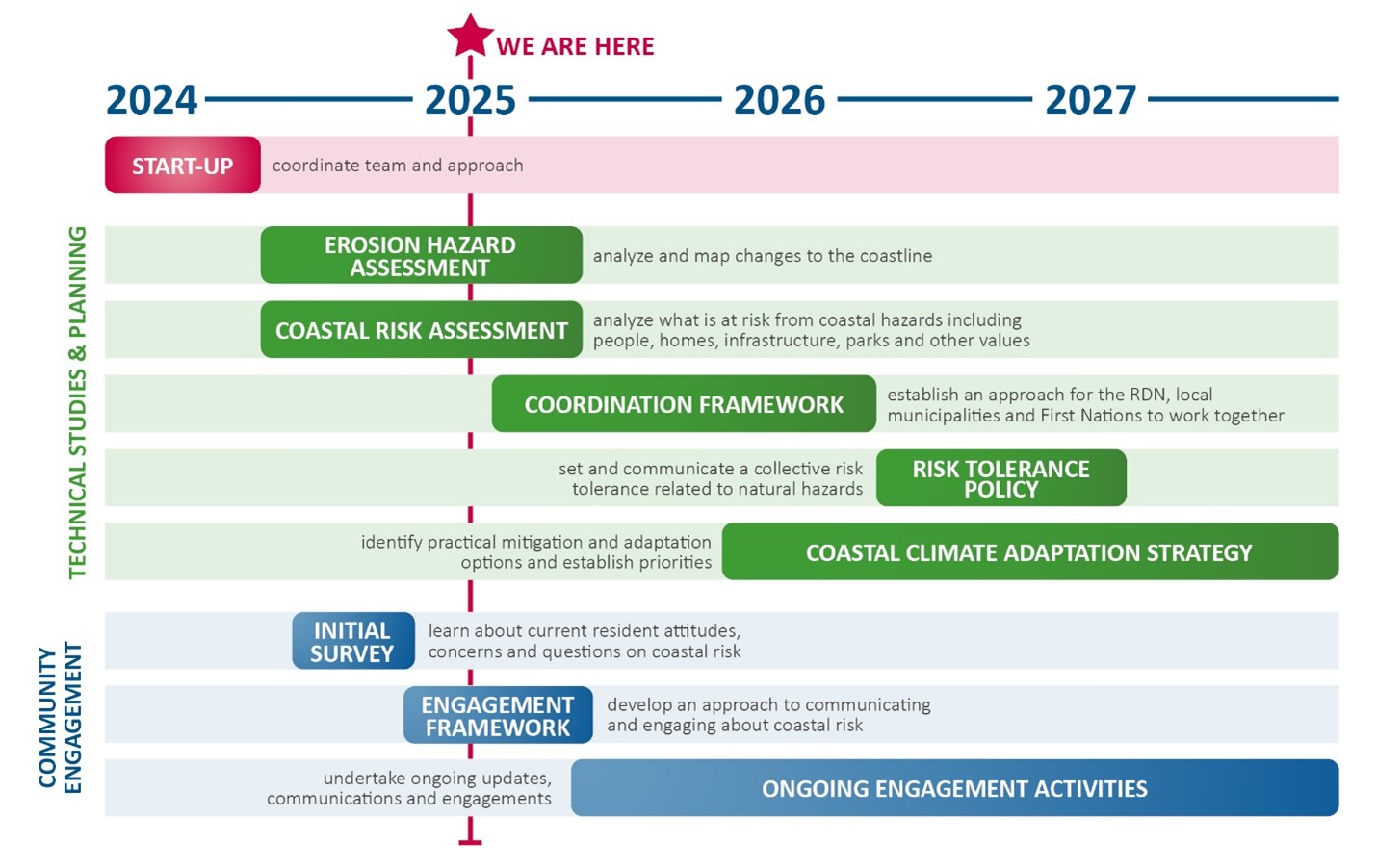 Planning for our coastal future is underway. The timeline below illustrates how far along we are in the engagement and technical and planning work. Both the technical work and engagement processes will continue simultaneously to address the challenges we face along our coast related to climate change.