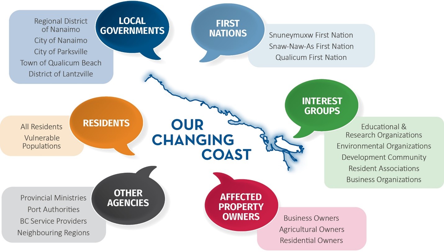 Although Our Changing Coast includes the entire RDN, the study area for the Coastal Flood Risk and Erosion Assessments encompasses all the RDN, except for the City of Nanaimo and Snuneymuxw First Nation Reserve lands, which are being assessed through a separate process.