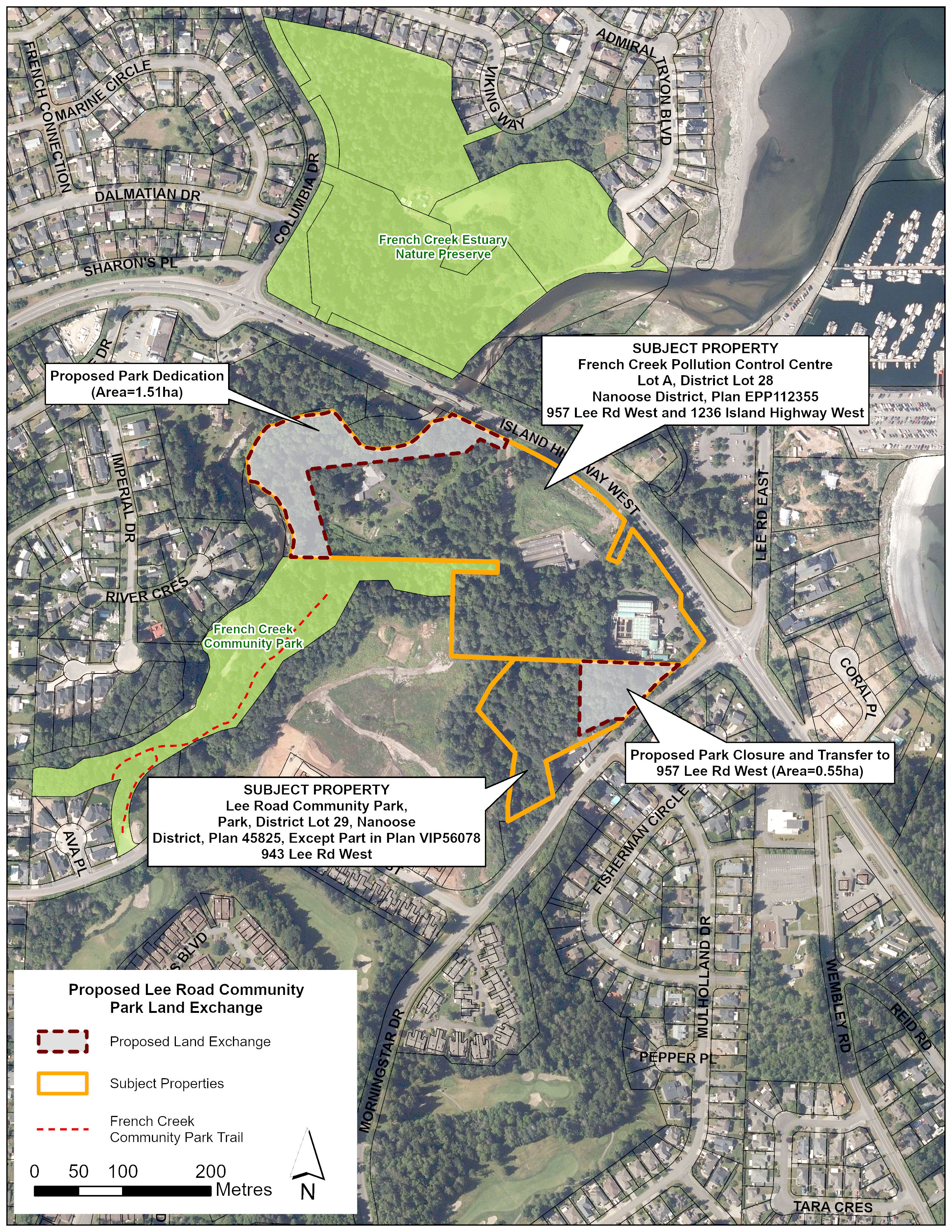 - That part of Lee Road Community Park: to redesignate approximately 0.55 hectares of Lee Road Community Park from Parkland/Greenspace/Natural Area to Institutional. The proposal is to dispose of this section of the Park in exchange for parkland dedication adjacent to French Creek. The subject area is located on the north east portion of the park and is adjacent to Lee Road and the existing FCPCC. This land is the proposed location of the operations services building which is part of the FCPCC expansion project and a portion of which currently serves as a driveway entrance to the FCPCC site.