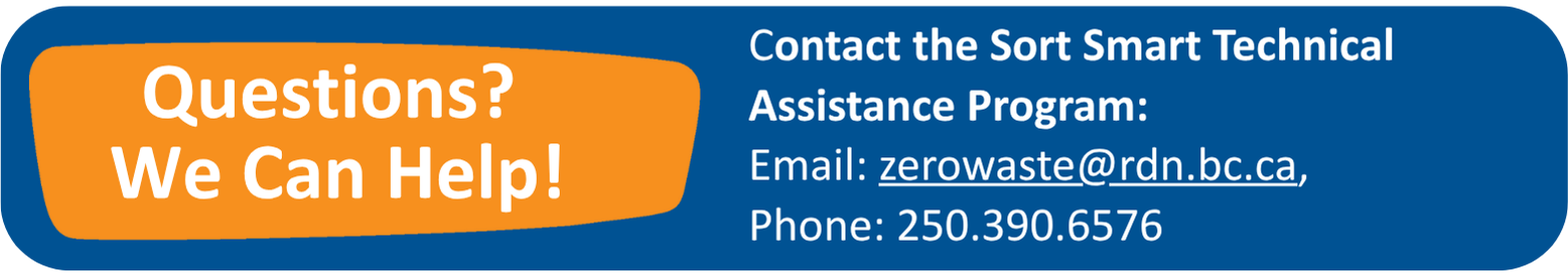 We Can Help: Do you oversee recycling and waste management at your workplace or multi-family residence and are looking to understand new three-stream sorting requirements? You are in the right place! Book your free Sort Smart Technical Assistance onsite visit today and take advantage of the opportunity to be recognized as a Sort Smart Partner in our community. Reach out to us at zerowaste@rdn.bc.ca or 250-390-6576.