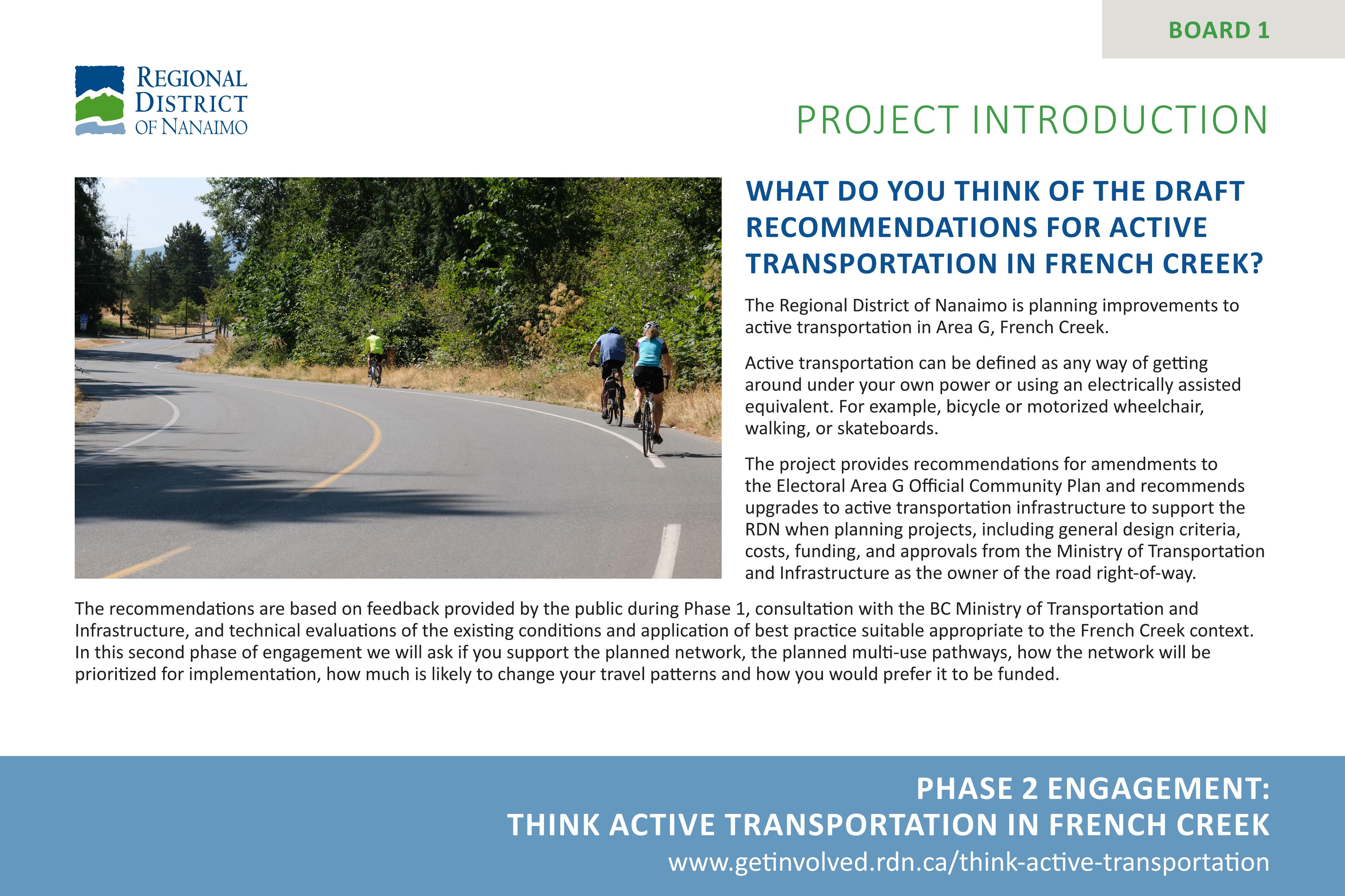 We are working to implement upgrades to infrastructure for active transportation within the French Creek Growth Containment Boundary area of Electoral Area G. The completed project will be incorporated as an amendment to the Electoral Area G Official Community Plan Bylaw 1540, 2008 (OCP).